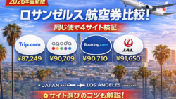 関西国際空港からロサンゼルス(LAX)の航空券を同じ航空会社・同じ便でTrip.com・Agoda・Booking.com・JAL公式の4サイトで比較。同じ便でもサイトによって価格が違う実態を検証します。