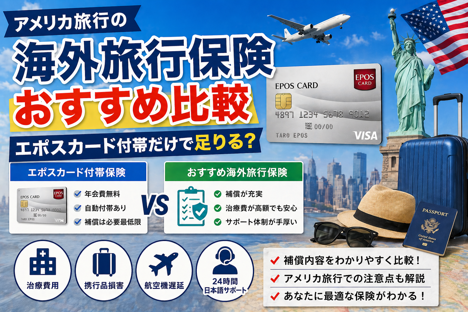 この記事ではアメリカ旅行(ドジャース観戦)向けの海外旅行保険を比較します。エポスカード付帯保険だけで足りるのか、単体保険は何を選べばいいのかを解説します。
