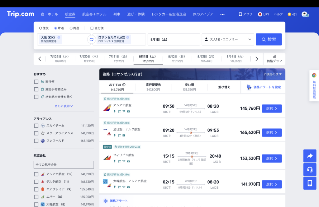Trip.comでの経由便(アシアナ航空・仁川経由)の結果は145,760円で3サイト中最安値でした。アジア路線だけでなく、北米の経由便でも競争力のある価格を示しています。アプリの使い勝手もよく、予約フローもスムーズです。