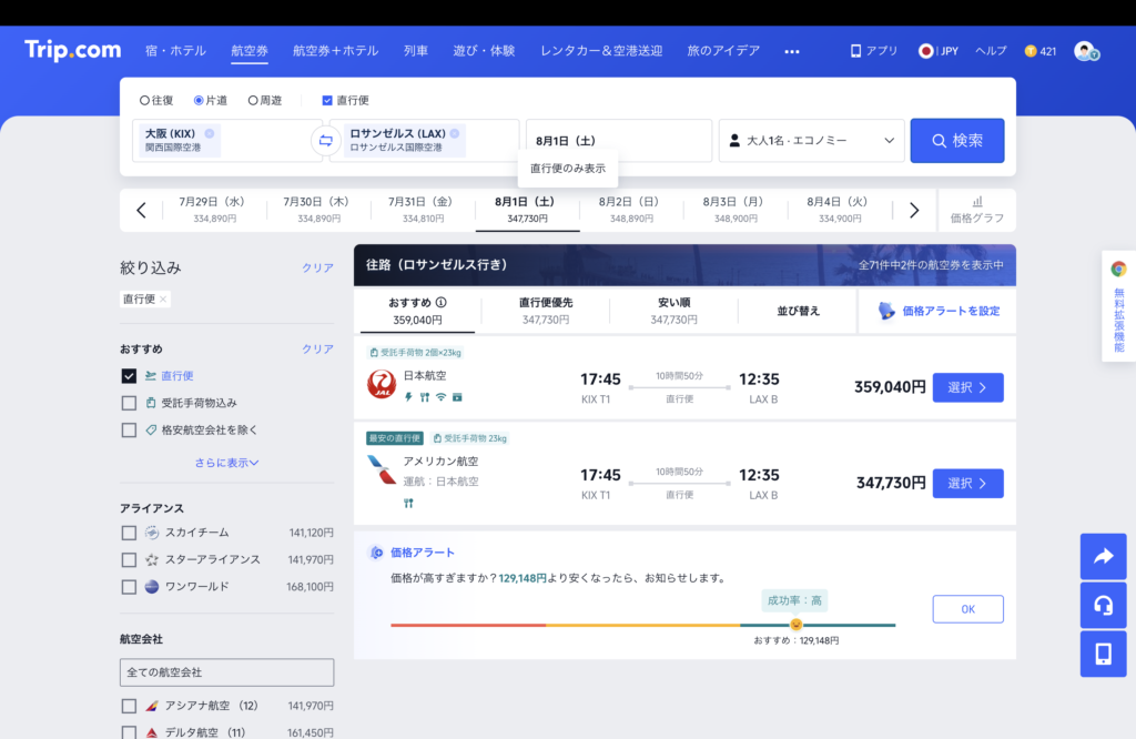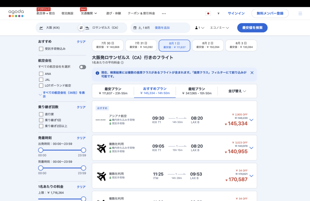 注目ポイント:経由便の最安はTrip.com(145,760円)、直行便の最安はAgoda(347,065円)。同じサイトが常に安いわけではありません。
