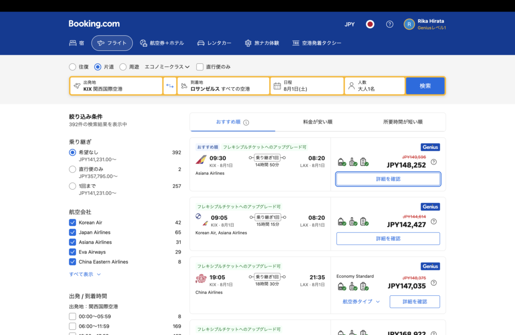 Booking.comでの同便結果は148,252円。Trip.comより約2,492円高い結果でした。ヨーロッパ・北米に強いとされるBooking.comですが、今回の経由便ではTrip.comに及びませんでした。