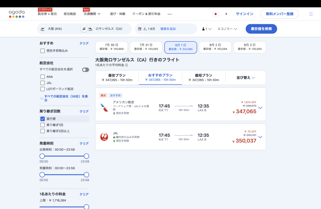 Agodaでの直行便結果は347,065円で4サイト中最安値でした。2位のJAL公式との差は約1,835円です。