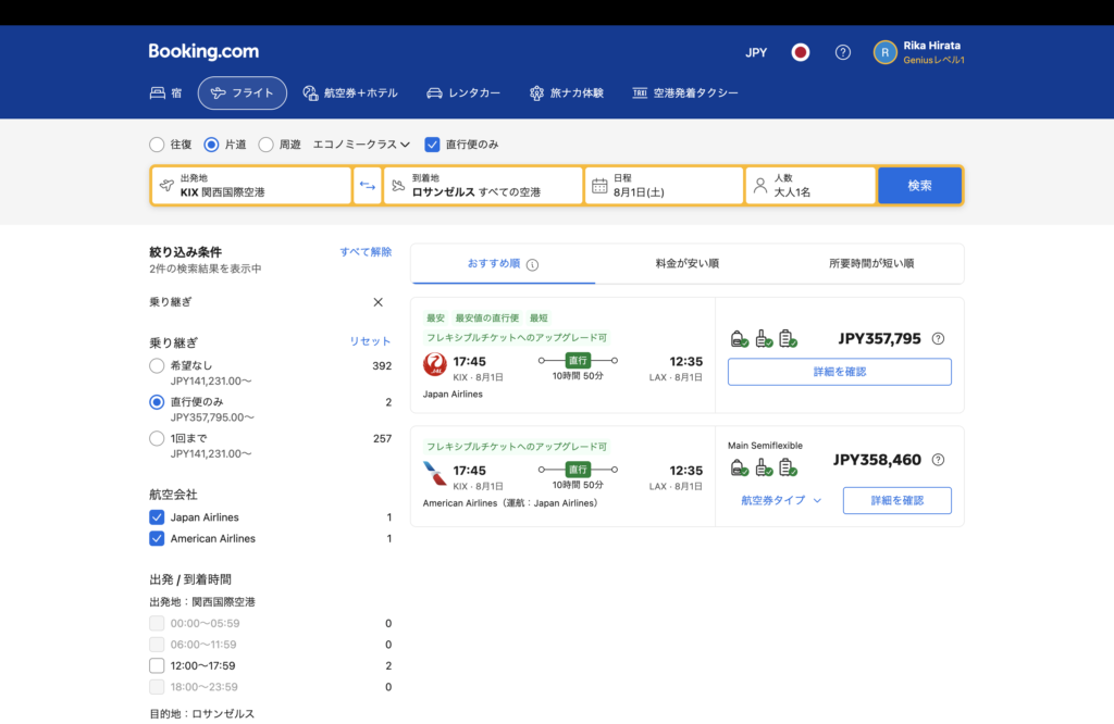 Booking.comでの直行便は357,795円。JAL公式より約8,895円高い結果でした。