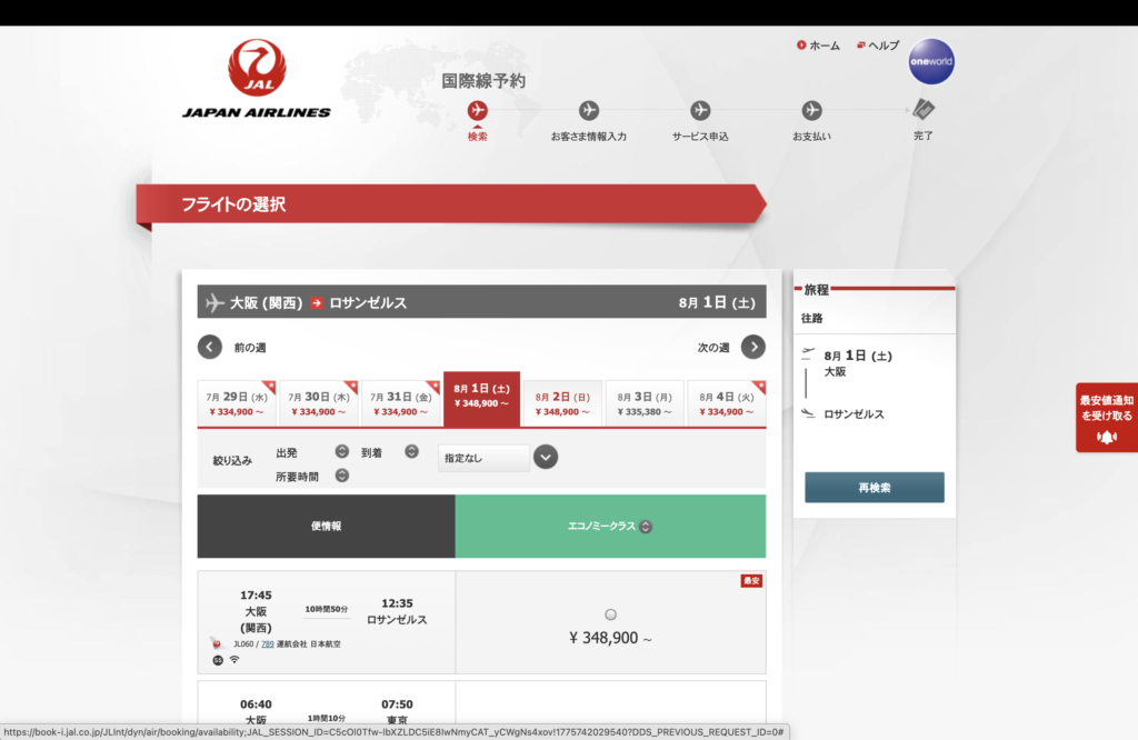 JAL公式サイトでの直行便は348,900円。最安のAgodaとの差は約1,835円と僅差でした。マイル積算・変更・キャンセル手続きのしやすさを考えると、JAL便を使うなら公式サイトも十分選択肢になります。