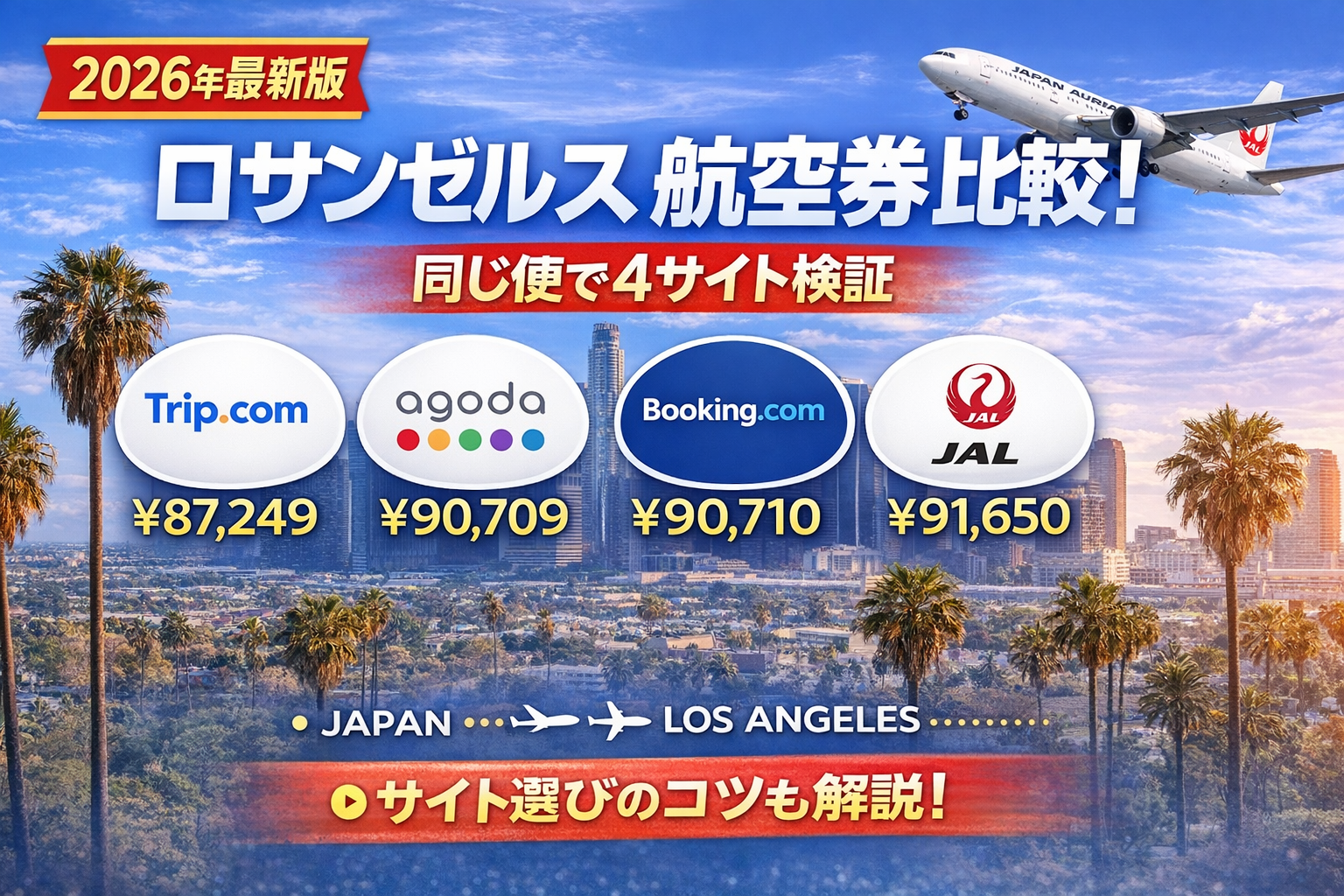 私の結論は「予約前に必ず複数サイトで同じ便を検索する」こと。ロサンゼルスのような長距離路線ほどサイト間の価格差が大きくなりやすく、5分の手間で数千〜1万円以上節約できます。