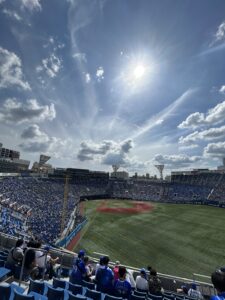 試合が始まった瞬間から太鼓と応援歌が鳴り響き、周りのファンが全員一緒に立って応援する。わたしはホーム側(ライト)で観ていましたが、隣に座ったベイスターズファンたちと一緒に声を出していると、いつの間にか完全に一体になっていました。斜め向かいのレフト(STAR SIDE)からはビジター側の声援も飛んできて、両軍の応援が交互に高まって、スタジアム全体が揺れているような感覚でした。
